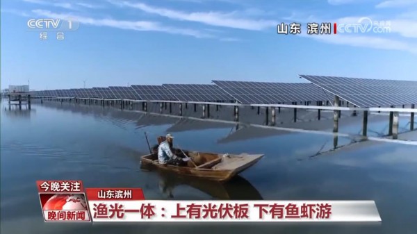 我们现在从陆地转向水域,在山东滨州沾化的这个盐田虾养殖区里,虾池上方是蓝色光伏板,25度倾斜角的设计,既能达到最佳发电效果,又能为虾池遮光、降温。光伏矩阵下,渔民撑一叶小舟为虾苗投喂饵料。每年,2000万尾盐田虾从这里游上全国餐桌,近4亿度清洁绿电并入电网。养殖业牵手新能源,奏出新时代的渔光曲。