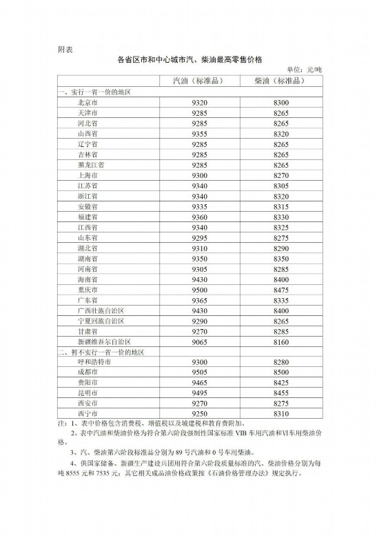 根据近期国际市场油价变化情况,按照现行成品油价格形成机制,自2023年6月13日24时起,国内汽、柴油价格(标准品,下同)每吨分别降低55元和50元。调整后,各省(区、市)和中心城市汽、柴油最高零售价格见附表。相关价格联动及补贴政策按现行规定执行。