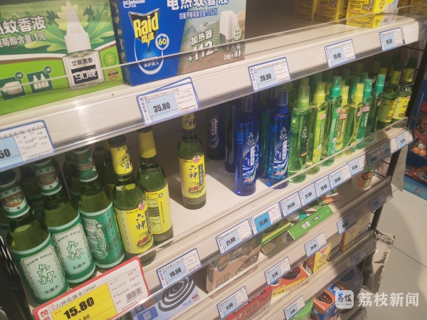 6月14日上午,记者在一家超市看到,店内盘香、电蚊香、灭蚊杀虫药喷雾等应有尽有,放在了最显眼的位置。销售人员表示,最近一段时间气温偏高,灭蚊产品卖得不错。消费者吴先生表示,驱蚊类产品是每年夏季的必需品。