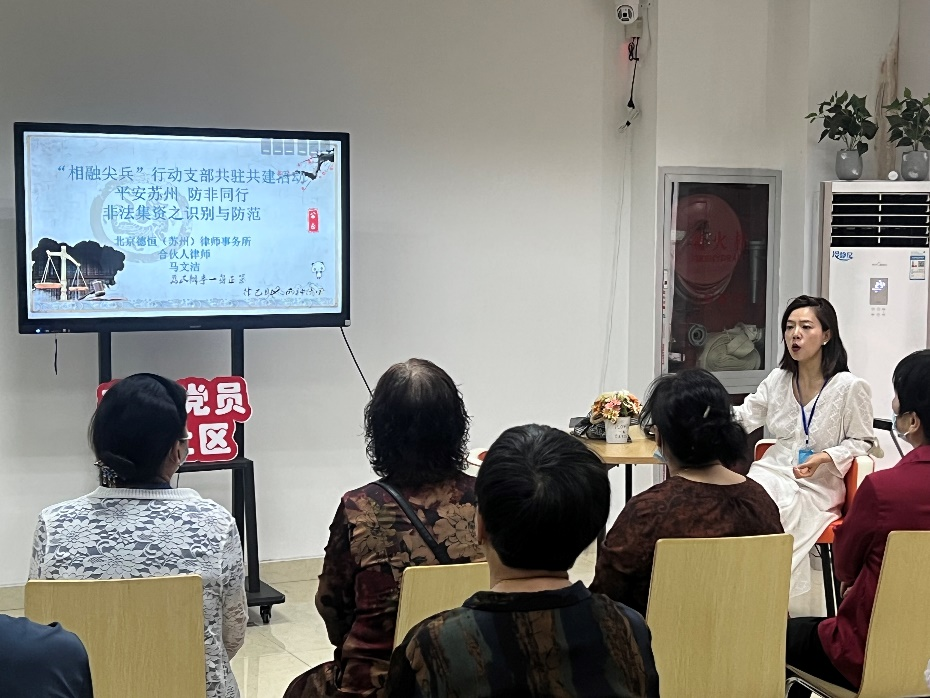 6月15日,区地方金融监管局党支部与元和街道建元社区党支部联合举行了“平安苏州 防非同行——‘相融尖兵’行动支部共驻共建活动”,邀请了北京德恒(苏州)律师事务所合伙人律师面向社区居民开展识别与防范非法集资宣讲。