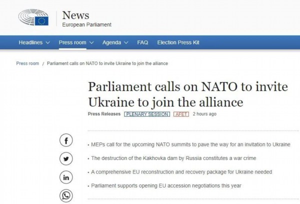 欧洲议会呼吁北约邀请乌克兰加入。图片来源:欧洲议会网站截图