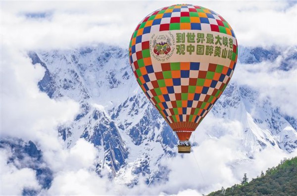 游客在米林市派镇乘坐热气球俯览雅鲁藏布大峡谷。