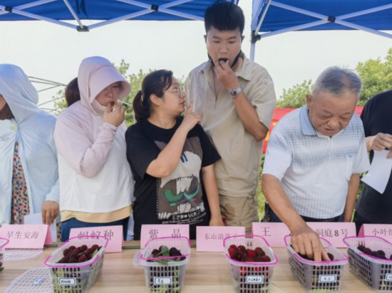 众多果树间,30个品种在桌上一字排开,其中有苏州人熟知的浪荡子、小叶细蒂等常规品种,还有最新培育的紫晶、王2、洞庭8号、西山早熟品种等,各个品种的大小、颜色、口感都各有不同。
