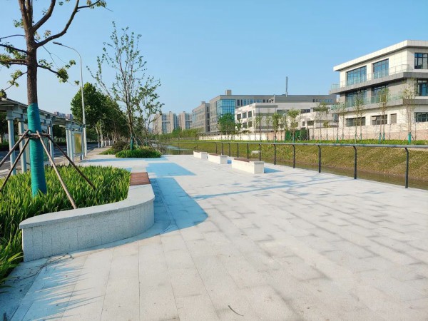 铺港河沿线原是公共绿化、苗木稀疏、园路破损不连贯。现在,经过系统规划设计,通过建设沿河栈道、翻新园路这里已串联形成了 2.5 公里的环形休闲步道。建成亲水平台3处、景观广场4处,休闲步道,园路两侧则种上了水杉、樱花及各类绿色乔木、地被。多元绿化与亲水设施的结合,将为市民打造出一个水韵灵动、精致美观的休闲场所。目前,工程已将近完工开放。苗木长势良好,现处于养护阶段。