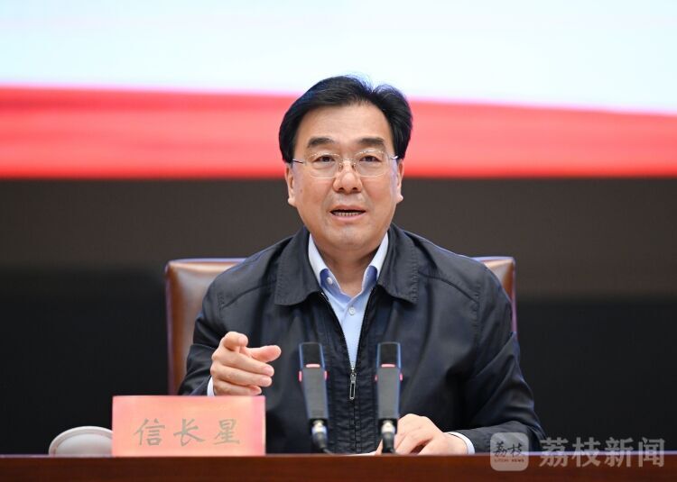 “反复学习领悟习近平总书记关于江苏工作的重要指示精神,一个突出感受就是,着眼全国看江苏、透过江苏谋全国,既充分体现了对江苏发展的关心关怀,更蕴含着对全国发展的战略思考和前瞻谋划,贯穿其中的是中国道路怎么走、江苏又如何为全国发展探路。”信长星围绕高质量发展、科技自立自强、生态文明建设、农业农村现代化、改革开放、全面从严治党等方面,结合重要时间节点,聚焦重大发展问题,与大家一起系统梳理、深入学习总书记重要指示精神。他指出,做党的创新理论坚定信仰者和忠实实践者,就要从新时代十年江苏坚定不移贯彻落实总书记重要指示、各项事业取得历史性成就和变化中,真切感悟习近平新时代中国特色社会主义思想的真理力量和实践伟力,牢牢把握新征程上江苏工作的总要求、总目标、总蓝图,切实担起“走在前、挑大梁、多作贡献”的重大责任。要坚持高质量发展不动摇、不偏向、不迟疑,把已经取得的成绩作为新的起跑线,以更加艰苦的努力应对前进中的风浪考验,真正做到继续走在前列。要更加深刻认识科技创新的极端重要性,打好攻坚战、持久战,在国家科技创新格局中勇担第一方阵使命,打造具有全球影响力的产业科技创新中心。要深入践行“两山”理念,久久为功建设令人向往的美丽江苏,走出一条经济发展和生态文明相辅相成、相得益彰的路子。要扎实推进农业农村现代化,学习运用浙江“千万工程”经验,全面推进乡村振兴,积极探索高水平建设农业强省之路,加快建设新时代鱼米之乡。要坚定不移全面深化改革、扩大高水平对外开放,大胆探索、勇于实践,在构建新发展格局中发挥重要的枢纽作用、支撑作用、示范引领作用。要坚决扛起“全面从严治党”首提地重大政治责任,大力弘扬清廉之风,一刻不停推进廉洁江苏建设,为全面推进中国式现代化江苏新实践提供坚强政治保证。