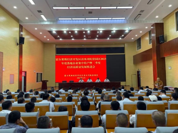 6月16日,霍尔果斯经济开发区清水河配套园区2023年度落地企业集中投产暨二季度经济高质量发展推进会召开。会议通报了园区上半年目标任务预计完成情况,对园区发展良好企业和先进个人进行了表彰,8家企业完成签约,24家企业集中投产。霍尔果斯经济开发区党工委委员,清水河配套园区党工委书记黎东参加会议并讲话。