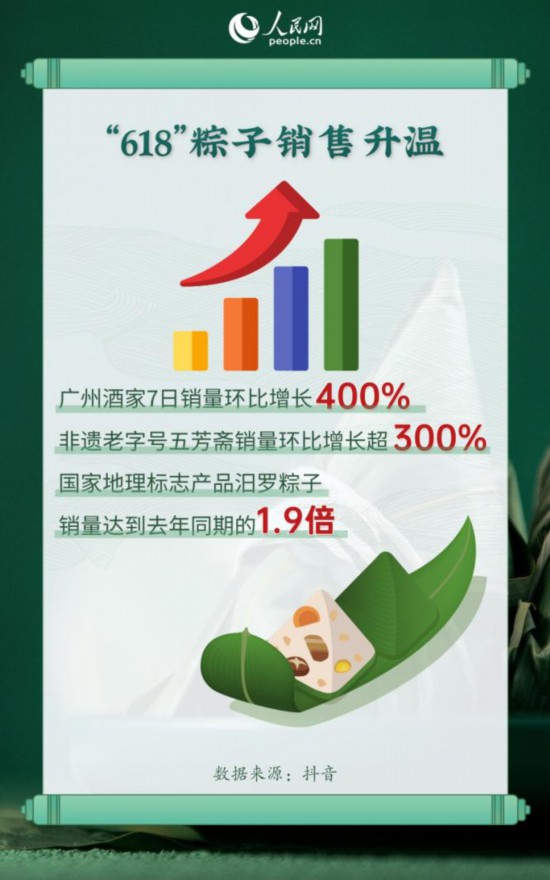 端午假期临近,“618”粽子消费逐渐升温。抖音数据显示,广州酒家在售的端午产品近7日销量环比增长了400%,五芳斋“诗韵粽子礼盒”销量环比增长超过300%。此外,随着90后、00后逐渐成为消费“主力”,粽子品类也在口味上不断做出革新,年轻消费者可选购鲍鱼粽、辣条粽、蒲烧鳗鱼粽、螺蛳粉粽、榴莲粽等产品。
