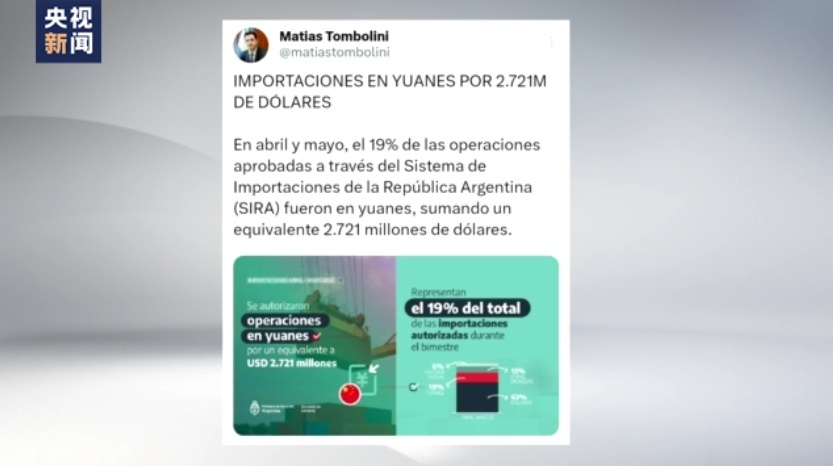 阿根廷经济部贸易国务秘书马蒂亚斯·通博利尼当地时间16日在社交媒体上发文宣布,今年4月和5月,阿根廷使用人民币结算了来自中国的价值27.21亿美元(约合人民币194亿元)的进口商品,阿根廷使用人民币结算的进口额达该国这两月总进口额的19%。通博利尼表示,以人民币结算进口商品有助于改善阿根廷外汇储备情况,增强该国对经济形势的调控能力。