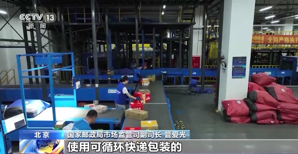 在浙江义乌的一家快递网点,记者看到绿色寄递区块被专门划分出来。消费者可以累计自己拿来的快递外包装数量,兑换不同城市间的寄递费用。而在运输环节,快递企业把以前的9.6米厢式货车,换成了15至17米长的高运力甩挂车,一下就能减少单位快件70%以上的污染物排放。跟着运输车,记者在分拣中心看到了绿色智能环保袋。