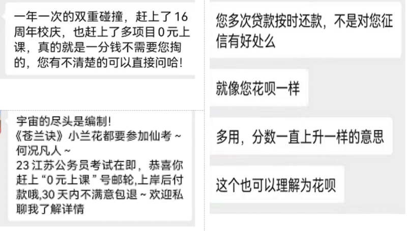 中公和研途两个机构的销售人员向体察员主动推销消费贷款或者分期服务。中公教育的销售人员会使用“0元学”或是“0元惠学”等宣传用语吸引消费者。但是体察人员在详细了解后发现“0元学”课程实际并非免费,而是需要贷款,只有在学员没有通过考试的情况下,培训机构会免除学费。销售人员还使用“助学贷款”概念误导消费者,类比“花呗”等产品,模糊其消费贷款本质。