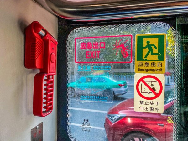 车厢中的紧急逃生窗(带红圈的玻璃窗)旁边配备了安全锤,发生意外时,可使用安全锤敲击紧急逃生窗红色圆圈提示位置,将窗户击碎后快速疏散。