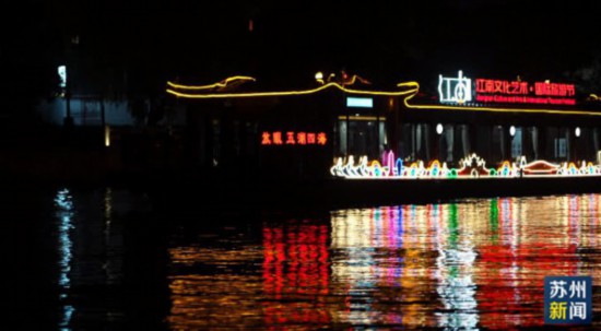在环古城河上,11艘装饰一新的“江南文化艺术·国际旅游节”主题游船投入运营,“君到苏州号”船身上还有虎丘塔、宝带桥、东方之门等地标建筑的图形。