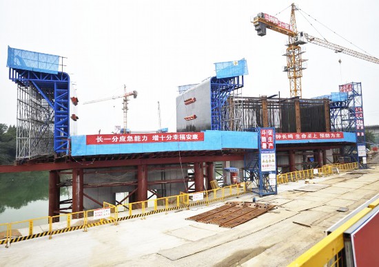 “江平东路东延工程道路横断面按主六辅六设置,主线按城市快速路标准建设,设计车速为80公里/小时;辅道按城市主干路标准建设,设计车速为50公里/小时。根据周边地块开发情况,道路断面分别采用高架式、地面式和隧道式的布设形式。凤凰节点采用主线上跨、辅道平交方式,主要以地面快速路为主。凤凰河至金湾河涉铁应急段全线共设置桥梁5座、箱涵1座,主辅出入口2对。其中,跨太平河桥梁3座(主线桥1座+辅道桥2座)、跨凤凰路主桥1座、跨凤凰岛路主桥1座,泰李路箱涵1处。目前正在实施的太平河桥梁工程,总共打下了238根桩,目前桩基工程已经完成,水中下部结构施工也已经结束,正在进行太平河大桥上部结构施工,约完成施工总进度的30%。”中铁24局项目负责人贾光龙介绍,目前施工人员正在抢抓有利天气施工,全力以赴保质保量按时完成各项目标任务。