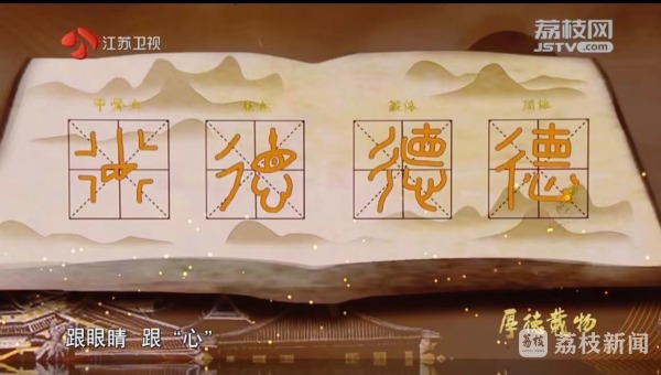 在“厚德载物”一集中,理查德·西尔斯分步讲解“德”这个会意字,“德”字里包括“目”和“心”,还有“行”的半边:“四周的四个构件表示十字路口,与现在的‘行’字甲骨文写法相同。中间的部分,是一个眼睛的形状,眼睛的上面有一条直线,表示眼睛要看得直、看得正。所以合在一起表达的意思是这个人看得正、行得正。后来,通过演变,在金文的‘德’字里,甲骨文的‘行’简化成‘彳’,在眼睛的下面又加了一个‘心’字,表示不仅要看得正,行得正,心也要正。这样的特质后来被引申为品德。一个人要眼正、行正、心正,这就是‘德’字的本义。”