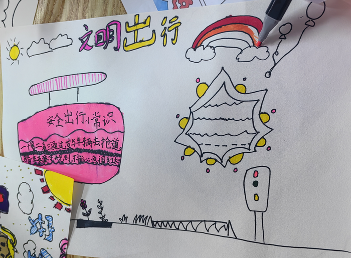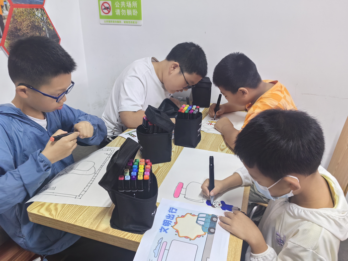 参加此次活动的小朋友主要是六合经济开发区园区内新业态群体子女和龙池街道毛许社区新就业群体子女,小朋友父母主要为快递员、外卖员、网约车司机、货车司机等灵活就业人员。“在座的各位小朋友,你们父母的工作大多与车打交道,有电动车、小汽车亦或大货车,你们最想对他们说什么?接下来就借助手中的画笔,把你们想对他们说的心里话‘讲’出来吧!”在工作人员的引导带动下,小朋友们拿起画笔,认真创作起来。戴着头盔安全行驶的外卖员、路口等红灯的行人、驾驶货车的司机……小朋友们发挥想象,并结合父母的工作制作出一幅幅精美的文明出行宣传海报。“我的爸爸是一名外卖员,总是风里来雨里去,我希望他工作的时候一定要戴好头盔、注意交通安全。”小学生周鹏认真地说道。