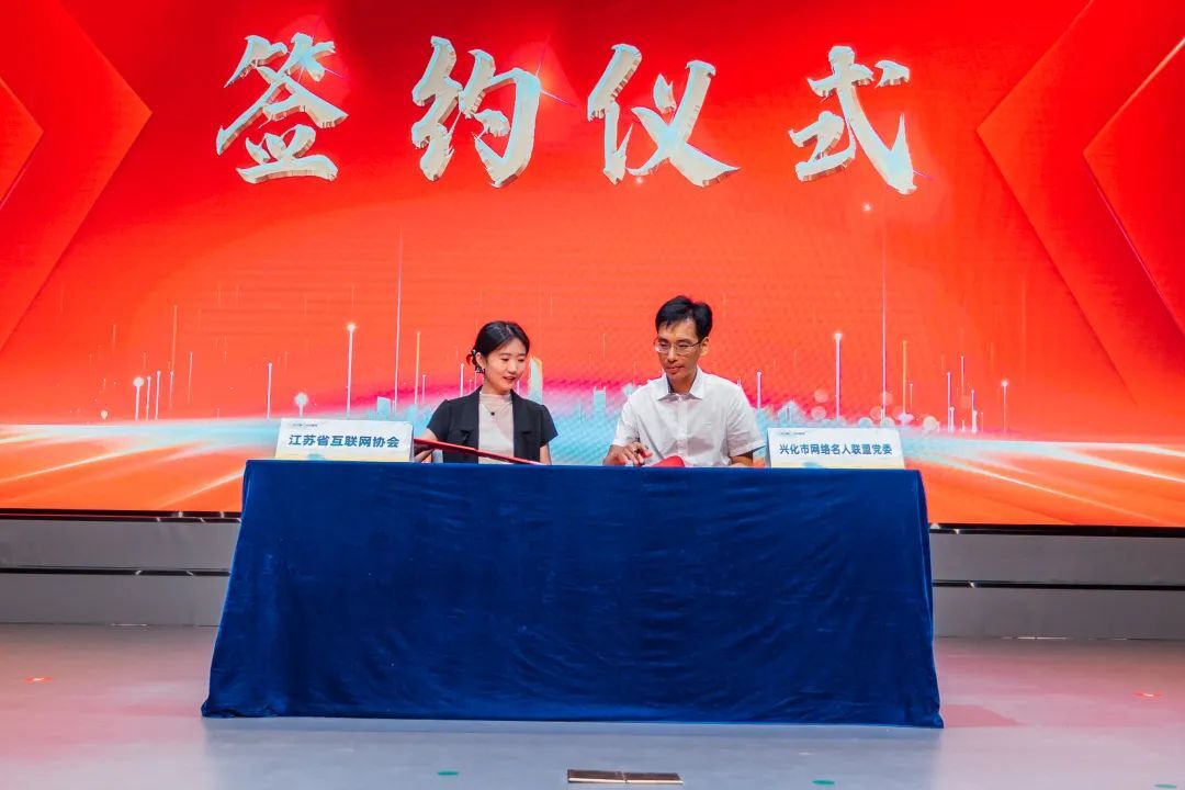 与会人员一起观看了《苏货直播成果总结宣传片》、专题片《e心向党 数字赋能》和网络名人联盟党委成员优秀作品展播;陈夏初、陈林峰共同为“苏货直播助农直播实训基地”揭牌;省互联网协会和兴化市委宣传部现场签订合作协议;新农人代表“乡村志玲”、红色主播代表“小刘支书”作发言。