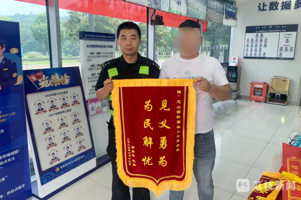 今天,南京市民王先生来到南京市公安局江北新区分局龙山南路警务站送上了锦旗。他说,自己和这个警务站还真是有缘分,这个警务站就在家附近,前几天,他到警务站寻求帮助,想找一个车牌号的车主,这位车主前几天及时提醒王先生车辆自燃,还帮助他灭火。非常巧的是,王先生要找的车主居然就在警务站里工作。