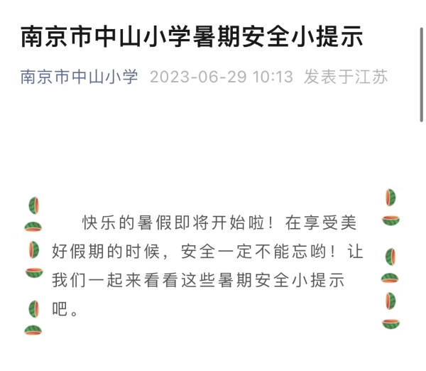 南京市中山小学德育主任段青青说,邀请法制副校长走进校园给孩子们进行暑期安全教育。“学校德育处针对暑期溺水、火灾以及交通安全等重要安全事故,对学生进行针对性的教育。希望可以提高学生安全意识和自防自护的能力。学校还将通过微信公众号推出致家长一封信,发布安全提示。”