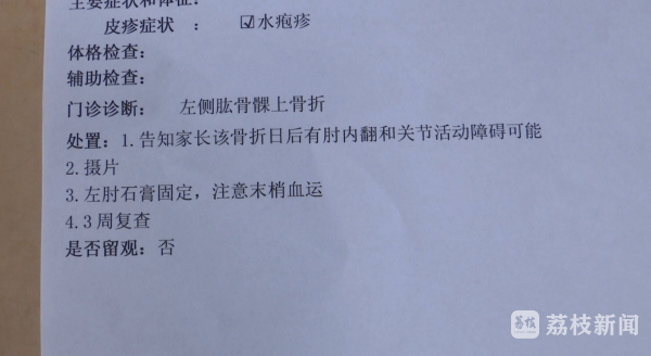 在杨女士提供的医院诊断报告中记者看到:左侧肱骨远端骨质断裂,软组织肿胀,左侧肱骨远端骨折。4月24日医院处置结果为:告知家长该骨折日后有肘内翻和关节活动障碍可能。
