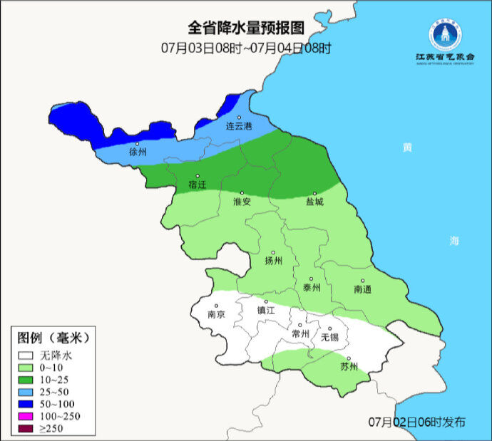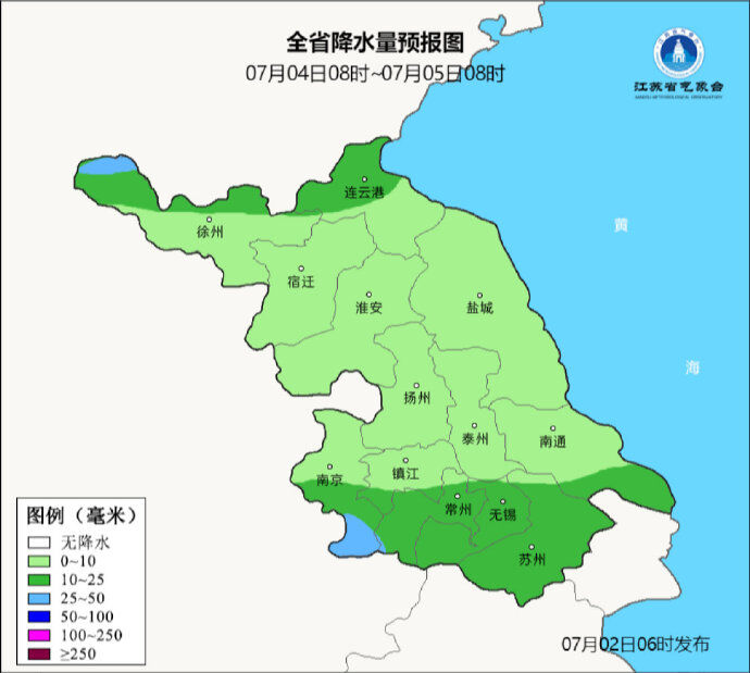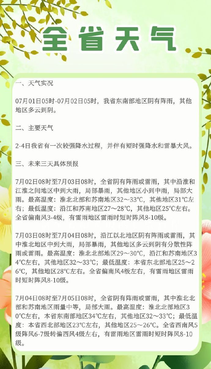 7月02日08时至7月03日08时,全省阴有阵雨或雷雨,其中沿淮和江淮之间地区中到大雨,局部暴雨,其他地区小到中雨,局部大雨。最高温度:淮北北部和苏南地区32~33℃,其他地区31℃左右;最低温度:沿江和苏南地区27~28℃,其他地区25℃左右。全省偏南风3-4级,有雷雨地区雷雨时短时阵风8-10级。
