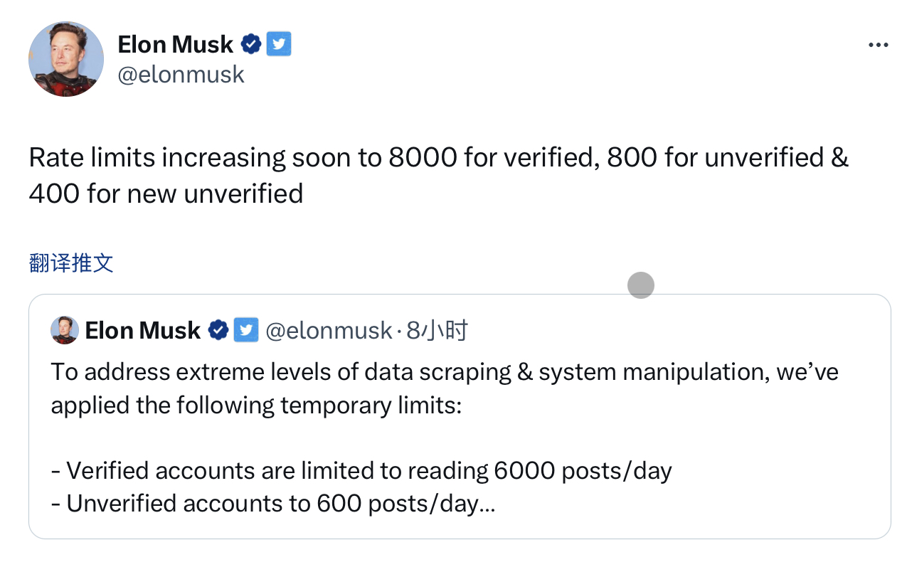 随后,马斯克又发布一条推文称,很快,已验证的账户浏览推文数量的限制将增加到8000条,未验证的账户将增加到800条,新注册的未验证用户将增加到400条。