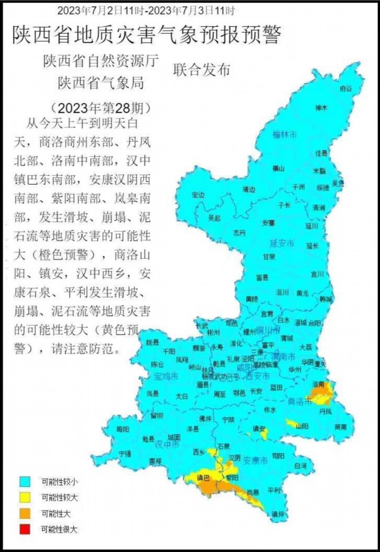 陕西省自然资源厅与陕西省气象局联合发布地质灾害气象预报预警:预计7月2日11时至7月3日11时,商洛商州东部、丹凤北部、洛南中南部,汉中镇巴东南部,安康汉阴西南部、紫阳南部、岚皋南部,发生滑坡、崩塌、泥石流等地质灾害的可能性大(橙色预警),商洛山阳、镇安,汉中西乡,安康石泉、平利发生滑坡、崩塌、泥石流等地质灾害的可能性较大(黄色预警),请注意防范。