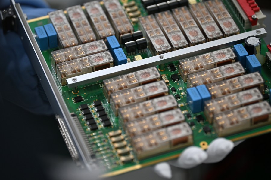 This photo taken on April 3, 2023 shows circuit boards produced by Traffic Control Technology Equipment Co., Ltd. in Wuqing District, north China's Tianjin.(Xinhua/Li Ran)
