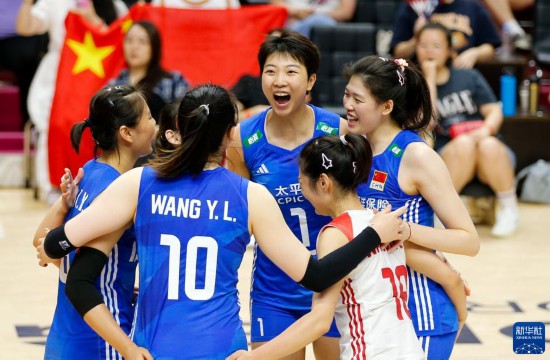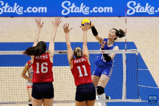 7月2日,中国队球员王云蕗(右一)在比赛中扣球。新华社记者 王益亮 摄