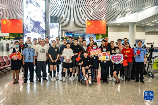 7月4日,中国女篮抵达广州白云机场后合影。新华社发(中国南方航空供图)