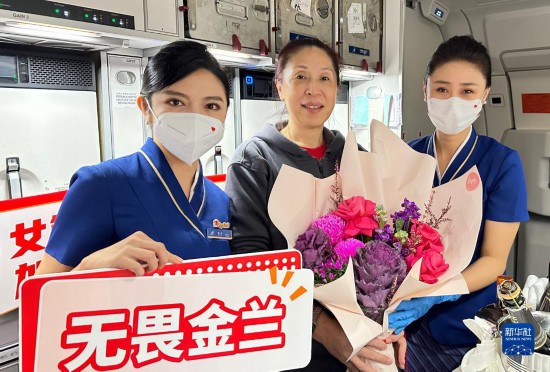 7月3日,机组人员给中国女篮主教练郑薇(中)送上花束。新华社发(中国南方航空供图)
