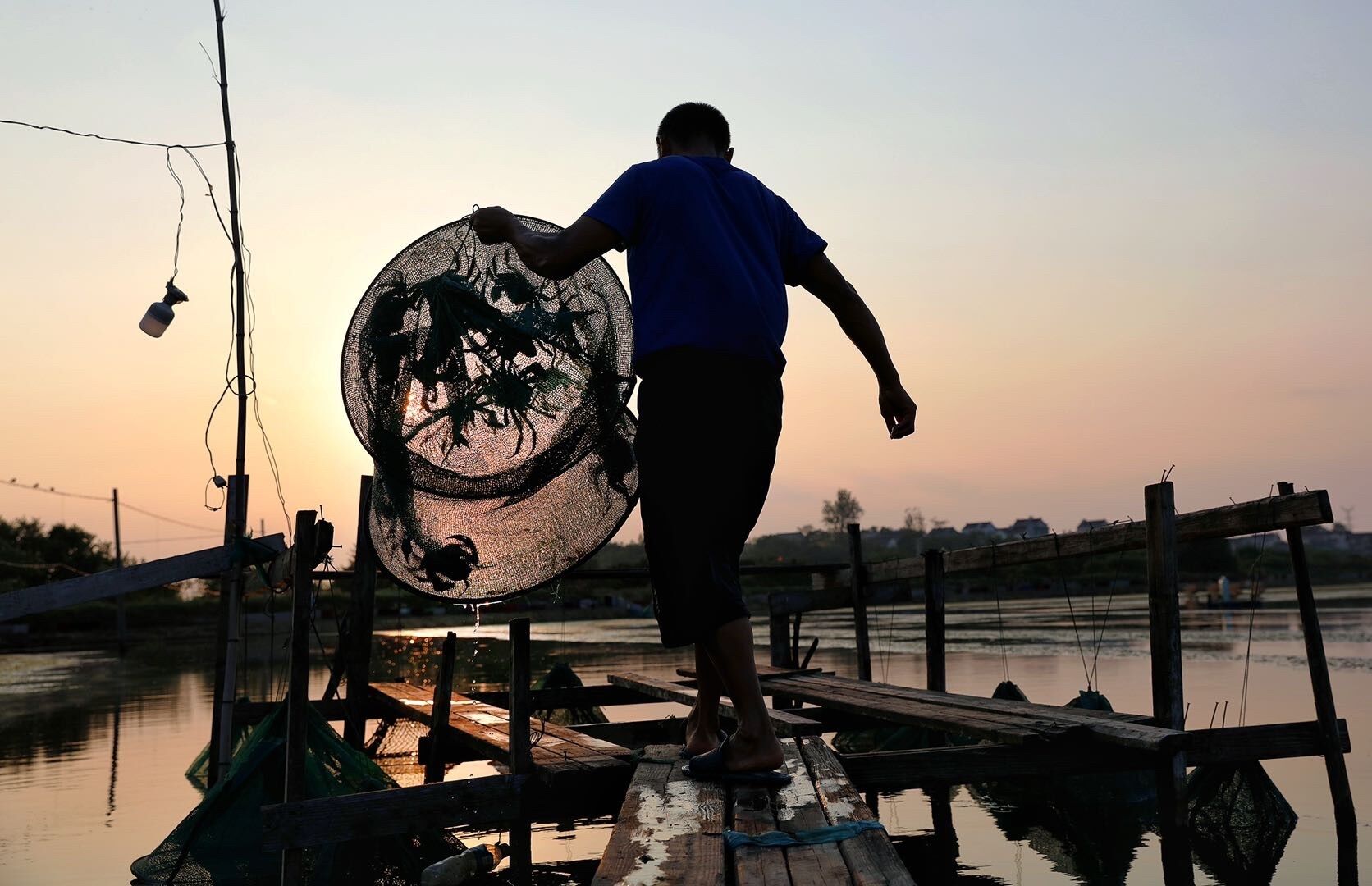 ▲江苏大闸蟹产区,忙碌的蟹农准备迎接销售旺季的到来。郝缦▕摄