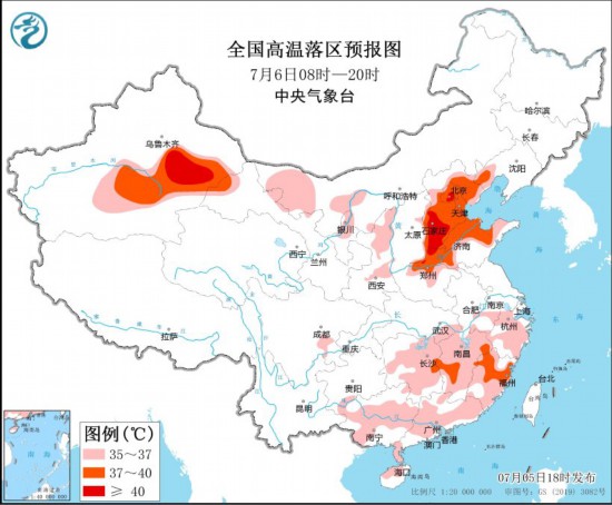 预计7月6日白天,华北中东部、黄淮中北部、江南、华南、新疆南疆盆地等地有35℃及以上高温天气,其中,河北大部、北京、天津、山东中北部、河南北部、江西中部、福建中部、南疆盆地东部等地部分地区最高气温37~39℃,北京东部、河北中南部、河南西北部等地部分地区可达40℃或以上。