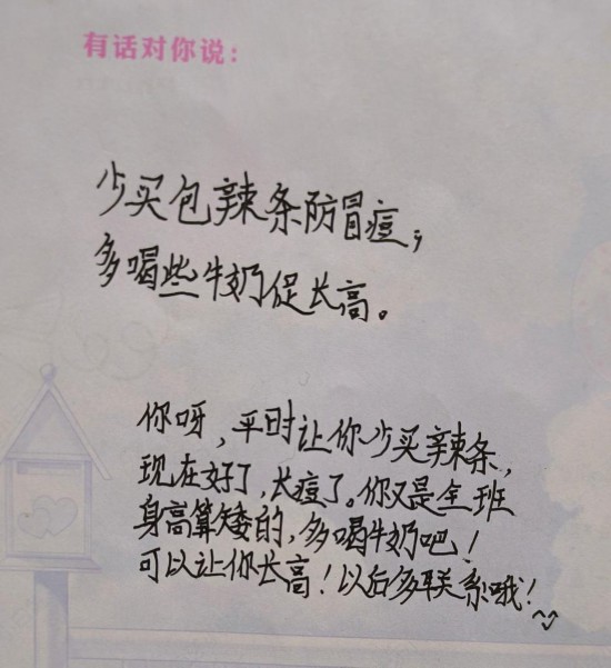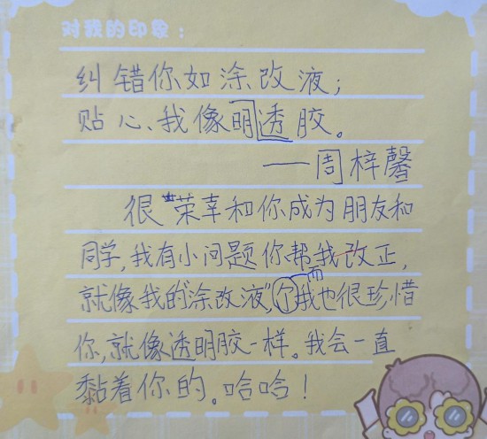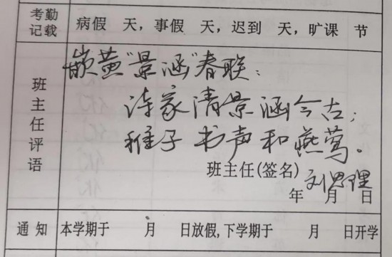 图为刘思理为黄景涵同学所写的嵌名春联评语