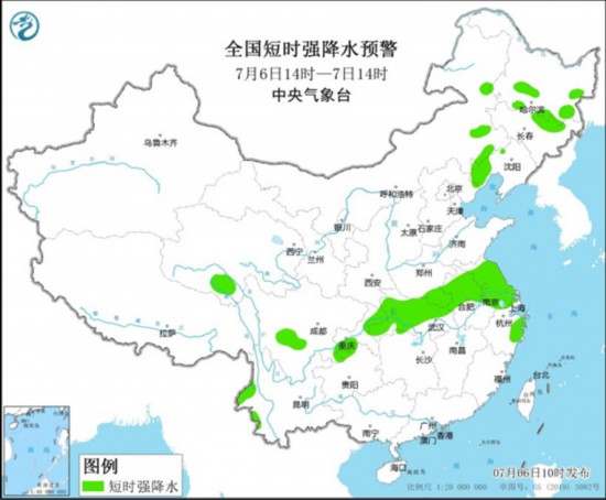 预计7月6日14时至7日14时,内蒙古东南部、黑龙江南部、吉林北部、辽宁北部和西部、北京东北部、安徽中部、江苏、湖北北部等地的部分地区将有8-10级雷暴大风或冰雹天气;内蒙古东南部、黑龙江南部、吉林北部、辽宁西部、青海南部、安徽中北部、江苏、上海西北部、湖北北部和西部、浙江北部和东部、四川南部、重庆东北部和南部、贵州北部、云南西南部等地的部分地区将有短时强降水天气,小时雨量20-50毫米,局地可达60毫米以上。