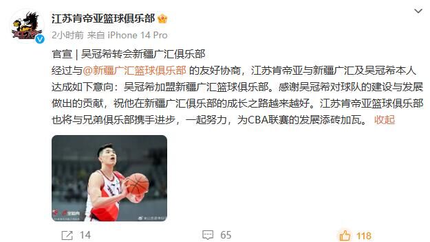 荔枝新闻讯 7月6日,江苏肯帝亚男篮发布公告,经过与@新疆广汇篮球俱乐部 的友好协商,江苏肯帝亚与新疆广汇及吴冠希本人达成如下意向:吴冠希加盟新疆广汇篮球俱乐部。感谢吴冠希对球队的建设与发展做出的贡献,祝他在新疆广汇俱乐部的成长之路越来越好。江苏肯帝亚篮球俱乐部也将与兄弟俱乐部携手进步,一起努力,为CBA联赛的发展添砖加瓦。