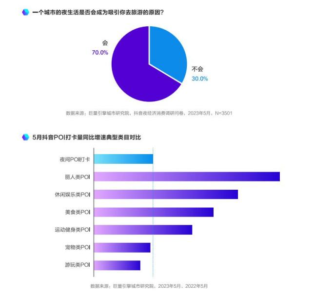 巨量引擎城市研究院统计,2023年1-5月期间有超过7000万人喜欢夜食、超过9300万人次喜欢在夜晚游玩、近5000万人次喜欢在晚上逛商场、超3000万人在抖音打卡了酒店住宿、超过6000万人在夜晚安排了休闲娱乐项目……