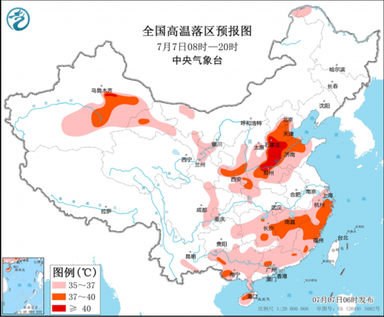 预计7月7日白天,华北中东部、黄淮、汾渭平原、江南、华南、四川盆地中部及新疆南疆盆地、甘肃中西部、宁夏西部等地有35℃及以上高温天气,其中,河北大部、北京、天津、山东中北部、河南北部、江西中部、福建中北部、浙江东部和南部、陕西关中、南疆盆地东部等地部分地区最高气温37~39℃,河北中南部、河南西北部等地部分地区可达40℃或以上(见图3)。中央气象台7月7日06时继续发布高温橙色预警。