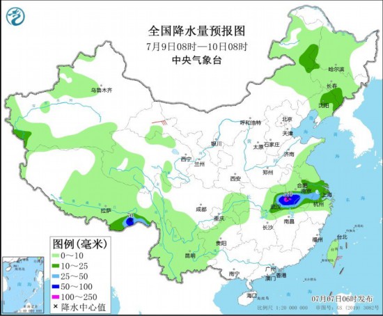 7月9日08时至10日08时,内蒙古东北部、黑龙江西南部、吉林东南部、辽宁北部和东部、江淮、江汉东部、江南东北部、西藏东南部等地部分地区有中到大雨,其中,安徽中南部、湖北东部、西藏东南部等地部分地区有暴雨或大暴雨(100~110毫米)。甘肃西部等地的部分地区有4~6级风(见图6)。