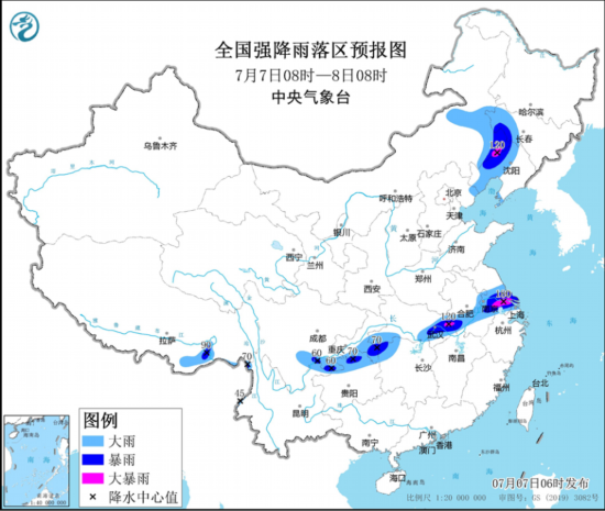 图1 全国强降雨落区预报图(7月7日08时-8日08时)