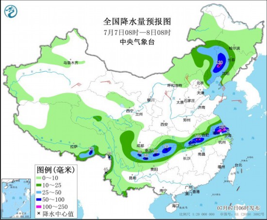 图4 全国降水量预报图(7月7日08时-8日08时)