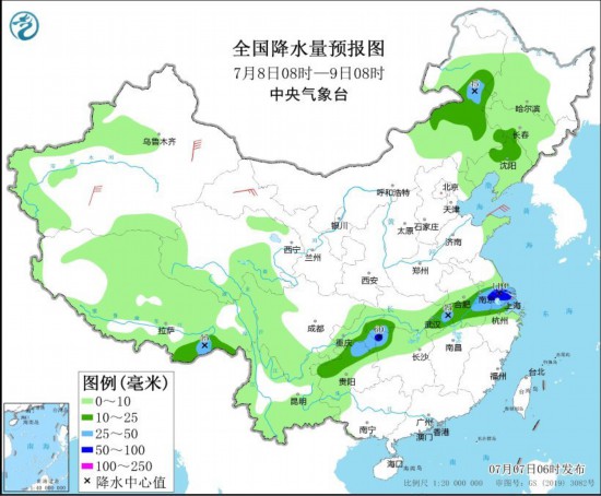 图5 全国降水量预报图(7月8日08时-9日08时)