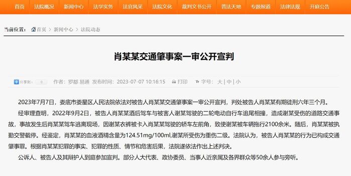 荔枝新闻讯 据湖南省娄底市娄星区人民法院网站消息,2023年7月7日,娄底市娄星区人民法院依法对被告人肖某某交通肇事案一审公开宣判,判处被告人肖某某有期徒刑六年三个月。