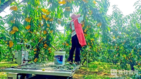 为了第一时间将新鲜水蜜桃送至顾客手中,孙建勤率先用起了“采桃机”。这款学名叫作“果园升降平台”的机器,升降自如,可以快速精准到达每一棵桃树,有了它的助力,采摘效率大幅提高。
