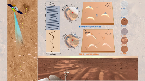 中科院国家天文台研究员李春来介绍,这一发现表明,祝融号着陆区可能经历了以风向变化为标志的两个主要气候阶段,风向从东北到西北发生了近70度的变化,风沙堆积从新月形亮沙丘转变为纵向暗沙垄。这一气候的转变,发生在约40万年前的火星末次冰期结束时,可能是由于火星自转轴倾角的变化。