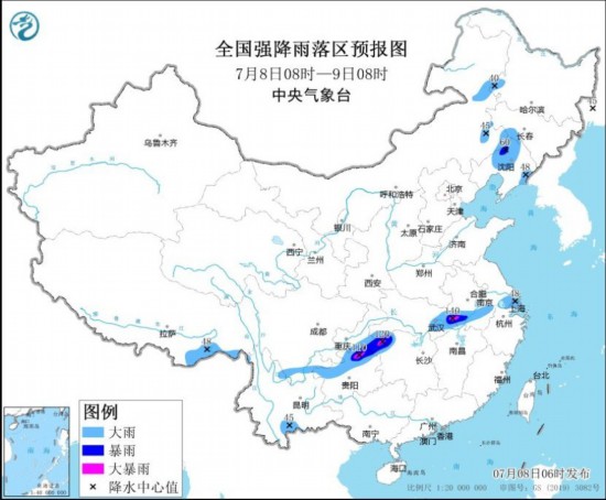 其中今天,四川南部、云南东北部和南部、贵州北部、重庆南部、湖南西北部、湖北西南部和东部、安徽南部、江苏南部、上海以及内蒙古东北部、东北地区南部等地部分地区有大到暴雨,湖北东北部、安徽西南部、湖南西北部、重庆东南部、贵州东北部等地局地有大暴雨(100~140毫米)。上述部分地区伴有短时强降水(最大小时降雨量30~50毫米,局地可超过70毫米),内蒙古东南部、黑龙江南部、吉林中西部、辽宁、山西北部、河北北部、北京西北部、山东北部和东部、安徽南部、江苏南部、上海、湖北东部和南部、浙江北部等地的部分地区将有8~10级雷暴大风或冰雹天气,局地风力可达11级。中央气象台今晨继续发布暴雨蓝色预警和强对流天气黄色预警。
