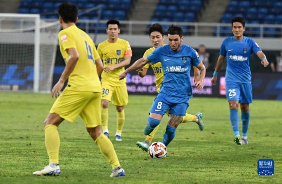 7月7日,南通支云队球员莫雷拉托(右二)在比赛中突破。新华社记者 孙凡越 摄