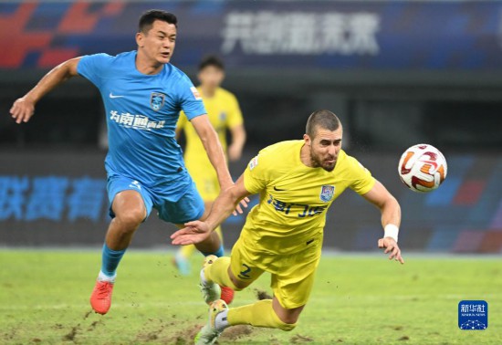 7月7日,天津津门虎队球员戴维·安杜哈尔(右)与南通支云队球员桂宏拼抢。新华社记者 赵子硕 摄