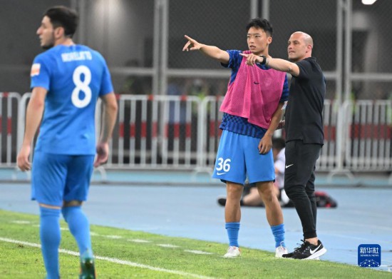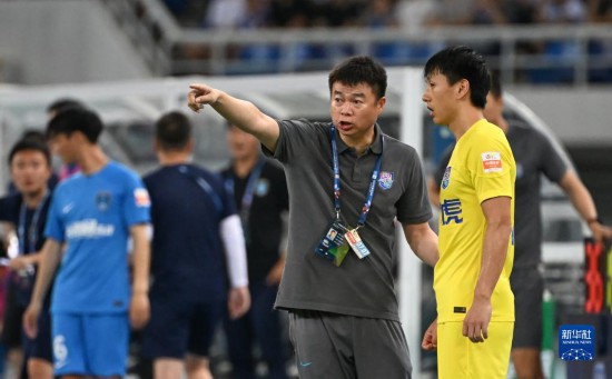 7月7日,天津津门虎队主教练于根伟(左)在场边对球员常飞亚布置战术。新华社记者 孙凡越 摄