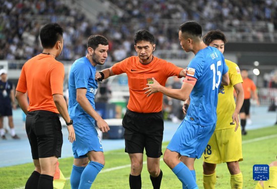 7月7日,主裁判艾堃(中)在比赛中进行调解。新华社记者 赵子硕 摄