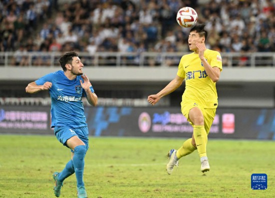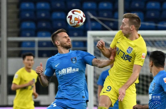 7月7日,天津津门虎队球员戴维·安杜哈尔(右)在比赛中头球攻门。新华社记者 赵子硕 摄
